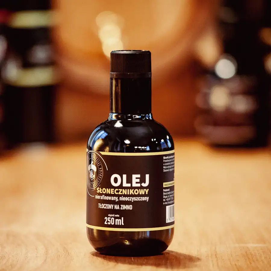 Olej słonecznikowy to obok oleju rzepakowego jeden z najczęściej spotykanych tłuszczów w kuchni. Jest bogatym źródłem wielonienasyconych kwasów tłuszczowych oraz witaminy E. Nierafinowany olej słonecznikowy posiada intensywny, złocisto – ciemny kolor. Jego słonecznikowy smak jest intensywny, a zarazem łagodny.