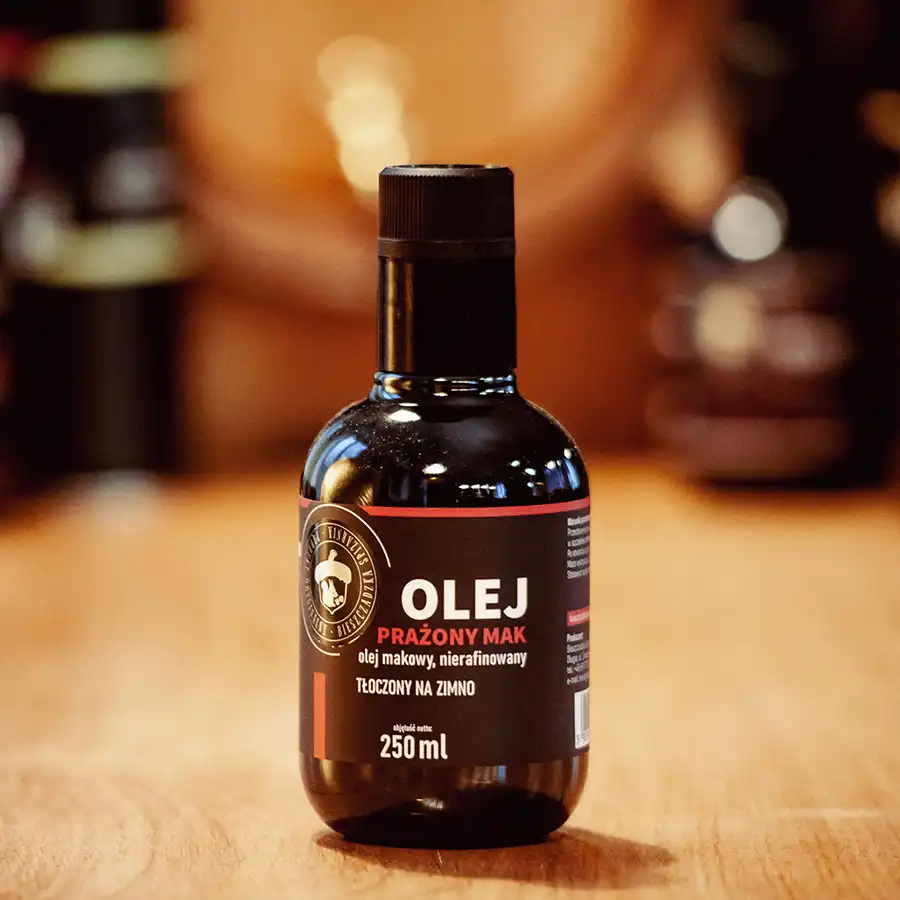 Aromatyczny, delikatny, orzechowo słodki  olej o smaku, który zaskakuje i rozpieszcza podniebienie. Tłoczony metodą na zimno z delikatnie prażonych, pełnych słodkiego oleju ziaren maku niebieskiego.